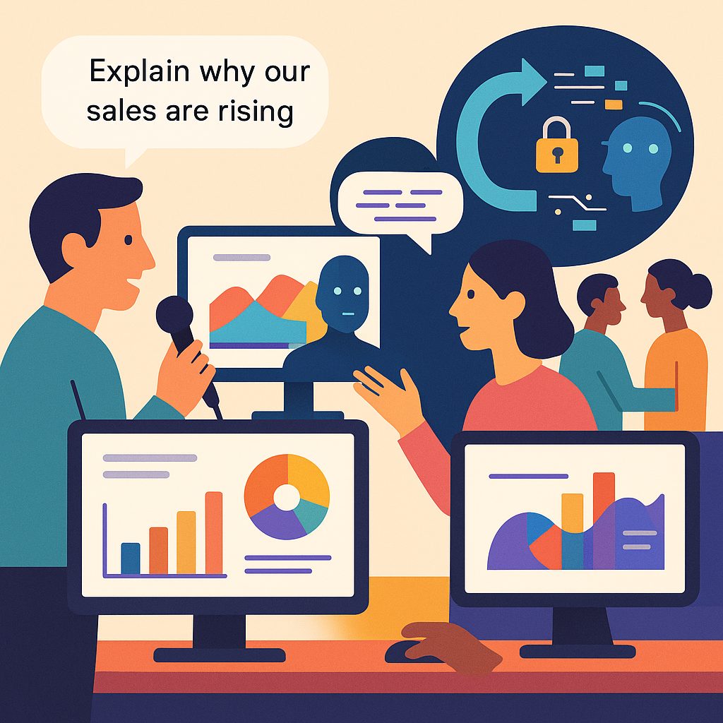 A: You can ask natural language questions like “Why did sales drop last month?”, “Who are my top customers?”, or “Predict my revenue for the next quarter.”